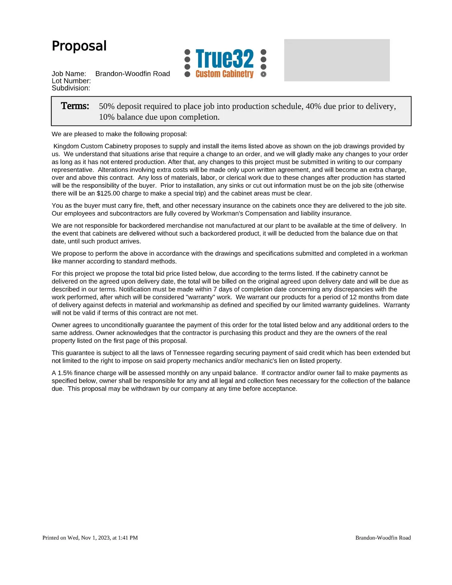 - A check for the deposit amount shown on the proposal